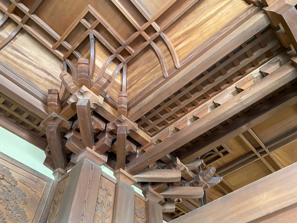 室内は正造さんの出身地である日光の東照宮を思わせる意匠で、茶色の木製パネル(二重板)の張られた内壁、斗栱(ときょう、軒を支える組み木)、かえる股(屋根の荷重を支える部材、装飾材としても)、天井高6mの折り上げ格(ごう)天井など、随所に正造さんのこだわりが見えます。