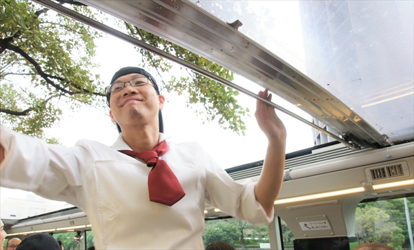 レストランバスが停止している間に、天井のルーフを開けてくれるスタッフ。外の空気を味わいながらの東京観光&食事は格別です!
